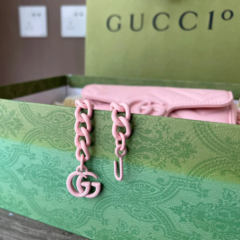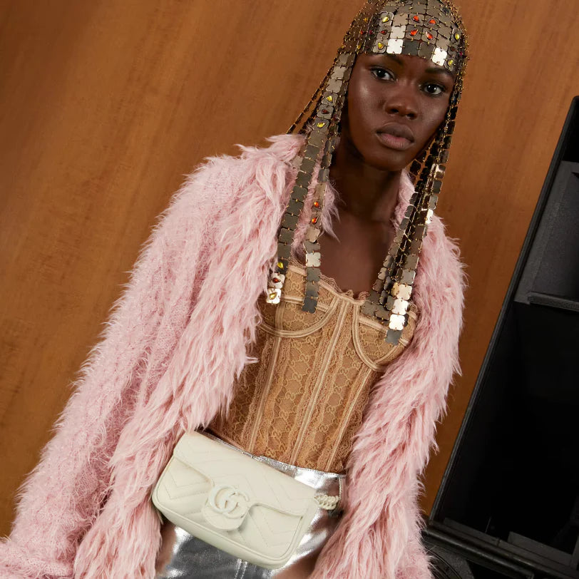 - Accessories continue to come to the fore of the Creative Director's collections. A distinctly contemporary accessory. the belt bag is presented in new ways throughout the brand narrative. emphasizing different elements of the versatile style. Here. it is introduced as part of the Marmont universe in chevron matelassé leather with a chain strap.