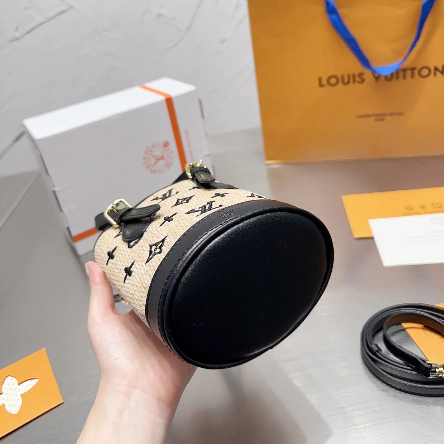 - The Nano Bucket bag combines cotton and leather trims. embellished with a Monogram motif on a petite bucket bag design. Use the adjustable leather handle and detachable and adjustable shoulder strap to explore more styling possibilities. Interior compartment features a leather key holder.