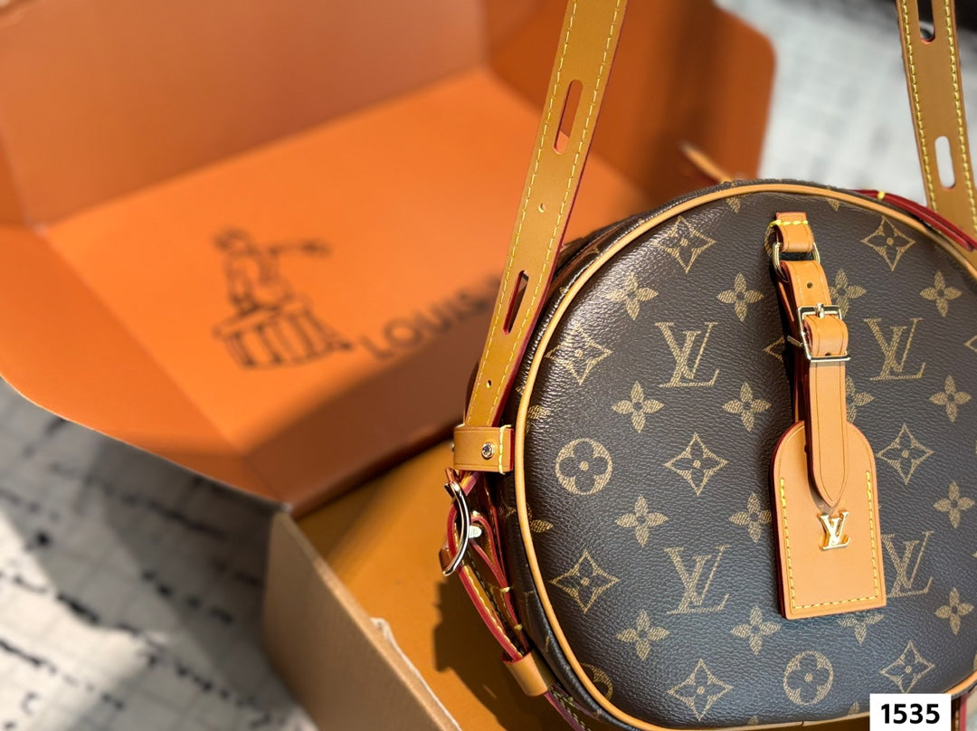 Small and practical, dual-version design: classic Monogram canvas with cowhide trim; trendy Reverse Monogram canvas with yellow calfskin trim. Size: 21*20cm